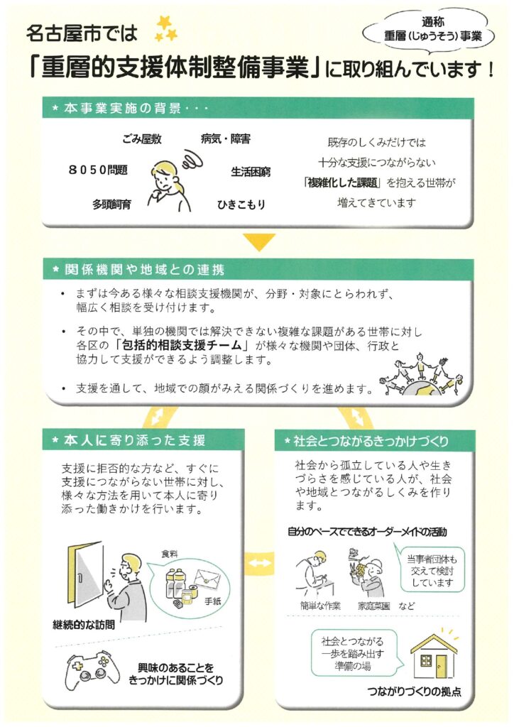 本市では、社会福祉法に基づき、介護、障害、子ども、生活困窮といった分野別の支援体制では対応がしきれないような「地域住民の複雑化・複合化した支援ニーズ」に対応する包括的な支援体制を構築するため、令和4年度から段階的に区ごとに包括的相談支援チームを配置し、令和6年度から全区において、既存の相談支援や地域づくり支援の取り組みを活かして、「属性を問わない相談支援」、「参加支援」、「地域づくりに向けた支援」を一体的に支援する「重層的支援体制整備事業」を実施しています。