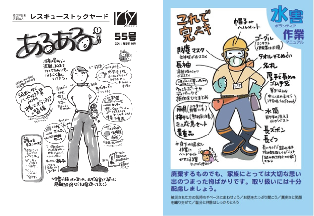 活動時の服装として、津波による水害にともなう泥出し、片付けの作業を行う場合には、防塵マスク、厚手で長めのゴム手袋、長靴が必要となります。 コンタクト使用の方は、ゴーグル装着も考えてください。