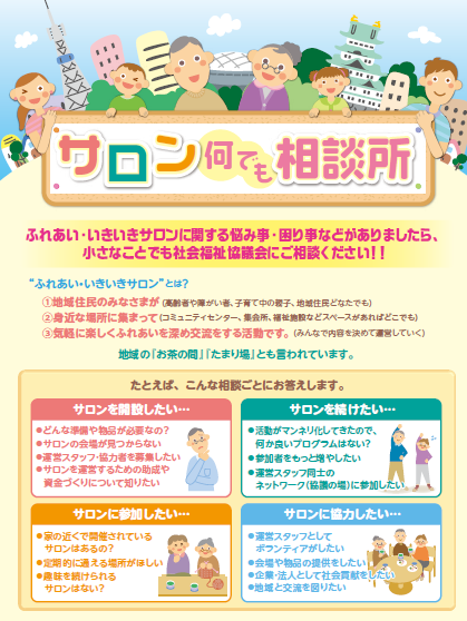 「サロン何でも相談所」(各区社会福祉協議会)へお気軽にご相談ください。